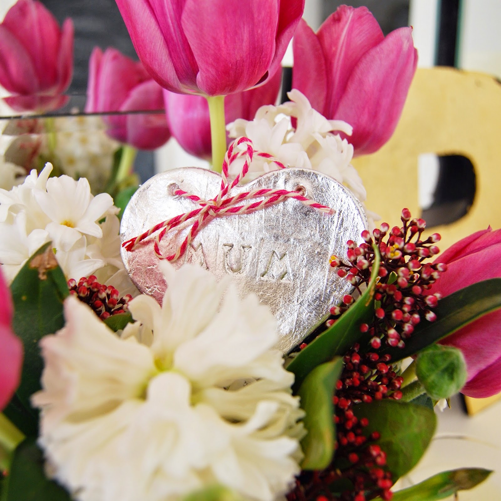 I used white clay and a cookie cutter to shape. We went for hearts but the choice is up to you. I have a box of letter stamps that we stamped into each shape. To make it easier for Raph I left the cookie cutter on the clay so he didn't misshape the heart. We then just stamped our message. Some black ink rubbed off but that didn't matter as I knew we would be painting them.